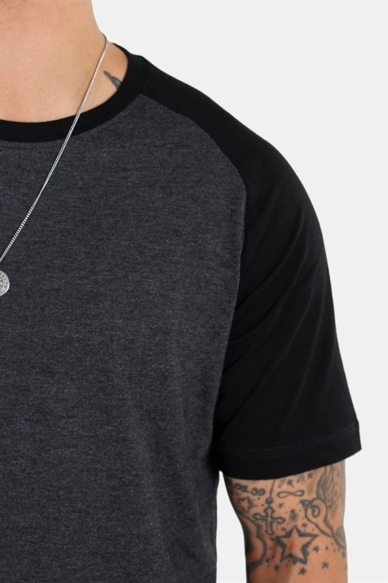 Short Sleeved T-shirt from Basic in gray anthracite with black sleeves. The neckline is round with a black ribbing. Good fit and has a ribbed bottom. The quality is 65% cotton and 35% polyester. THE MODEL IS APPROX. 1,83 CM AND 80 KG HE WEARS THIS PRODUCT IN A SIZE M