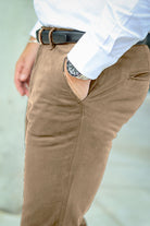 Diese Slim-Fit-Chinohose in einem warmen Beigeton überzeugt durch ihren modernen Schnitt mit mittlerer Leibhöhe und einem schmal zulaufenden Bein. Das Material bietet dank eines Elastananteils zusätzlichen Komfort und sorgt für eine angenehme Passform. Die Hose zeichnet sich durch ihr schlichtes Design mit klassischen Front- und Gesäßtaschen aus, perfekt für einen lässigen, dennoch gepflegten Look.
