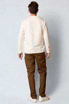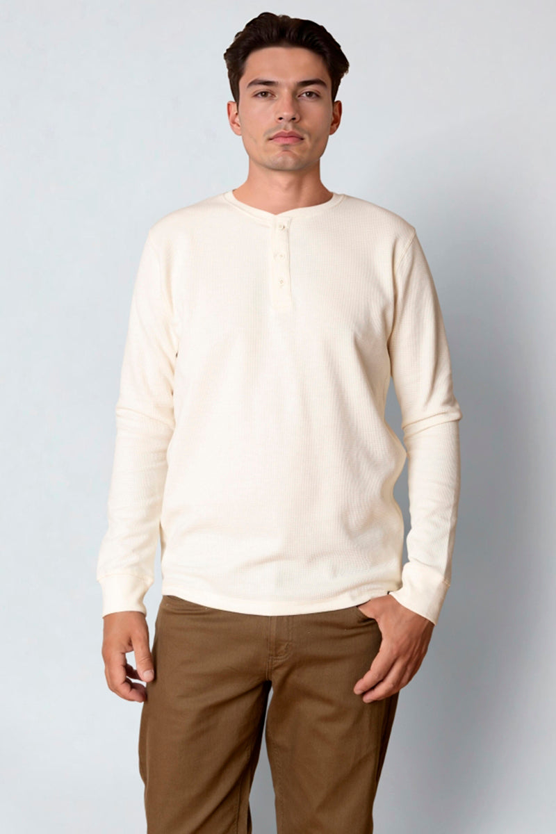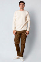 - Der Pullover hat Knopfleiste und Rundhalsausschnitt