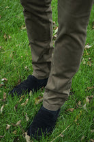 - Die Hose wird mit Knopf und Reißverschluss geschlossen.