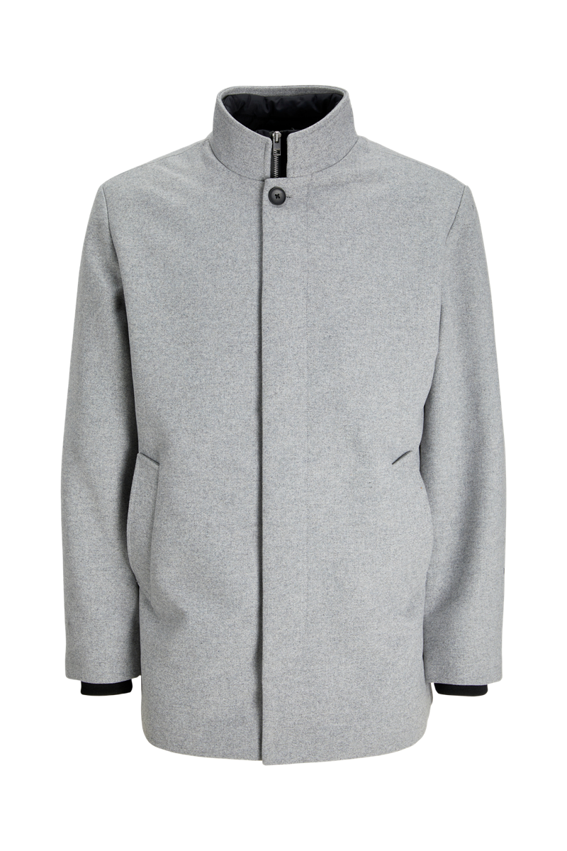 - Graue Wolljacke mit vertikalen Seitentaschen.
