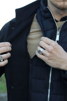 - Schwarze Wolljacke mit vertikalen Seitentaschen.