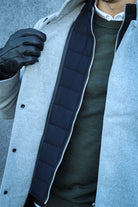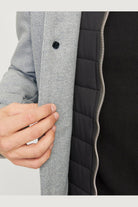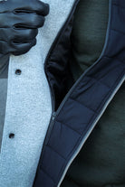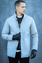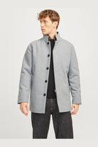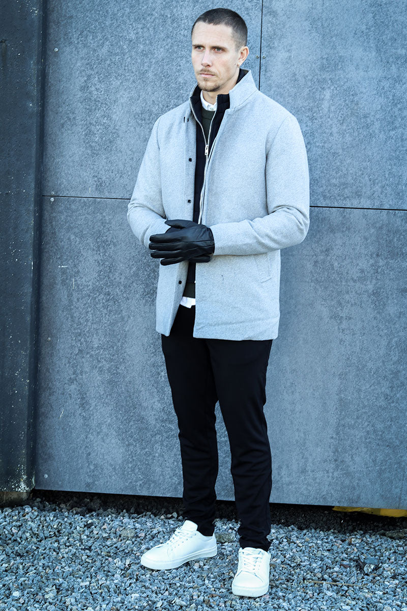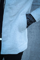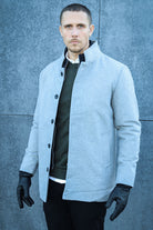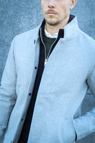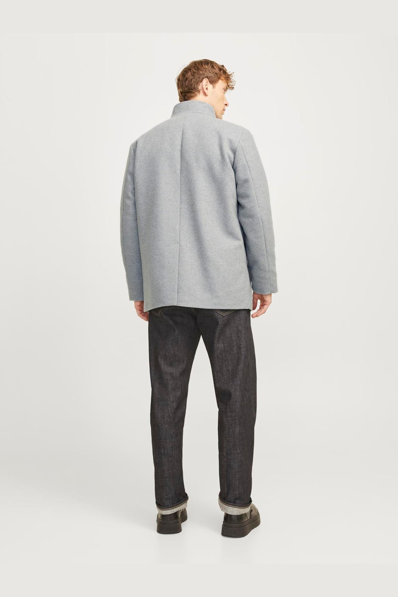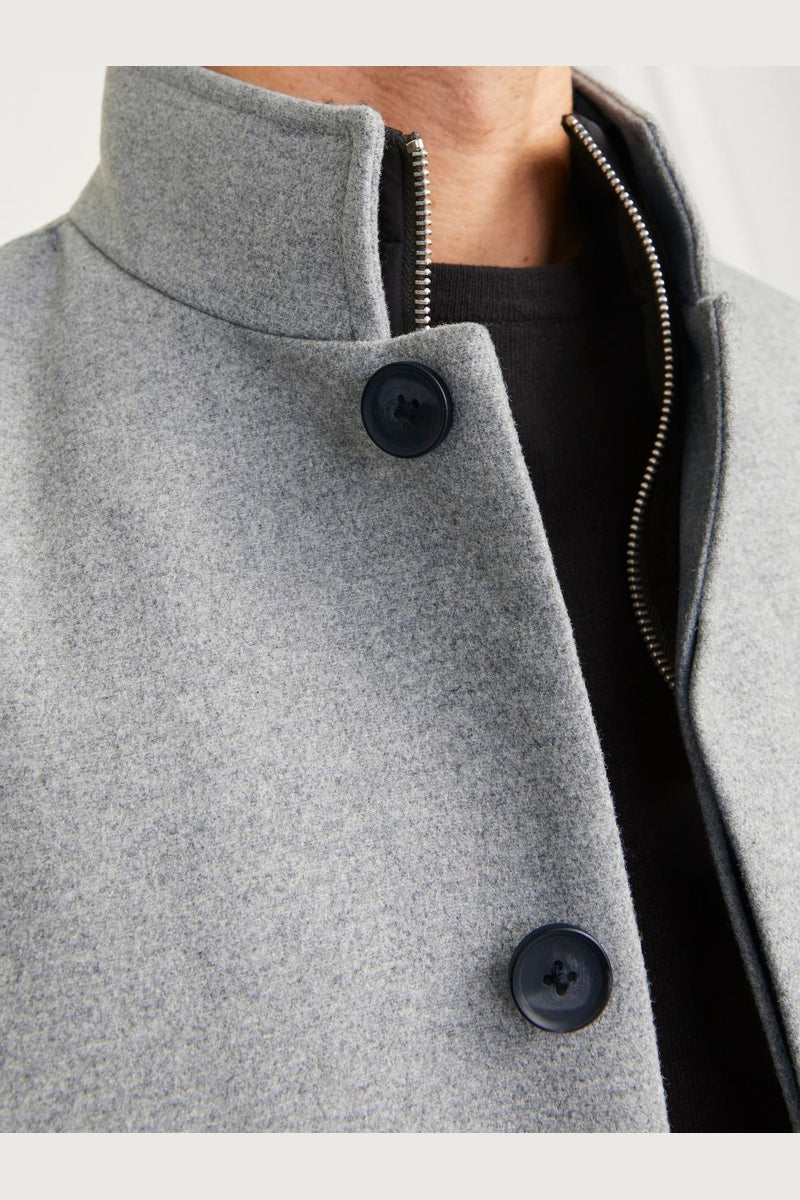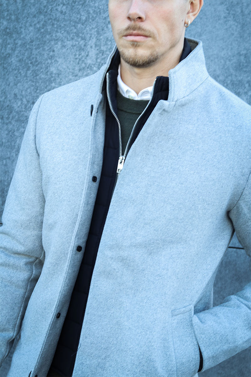 - Graue Wolljacke mit vertikalen Seitentaschen.