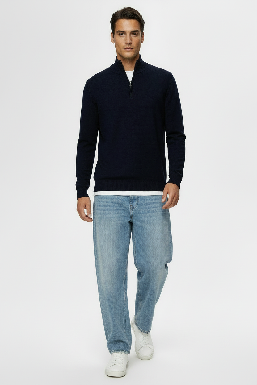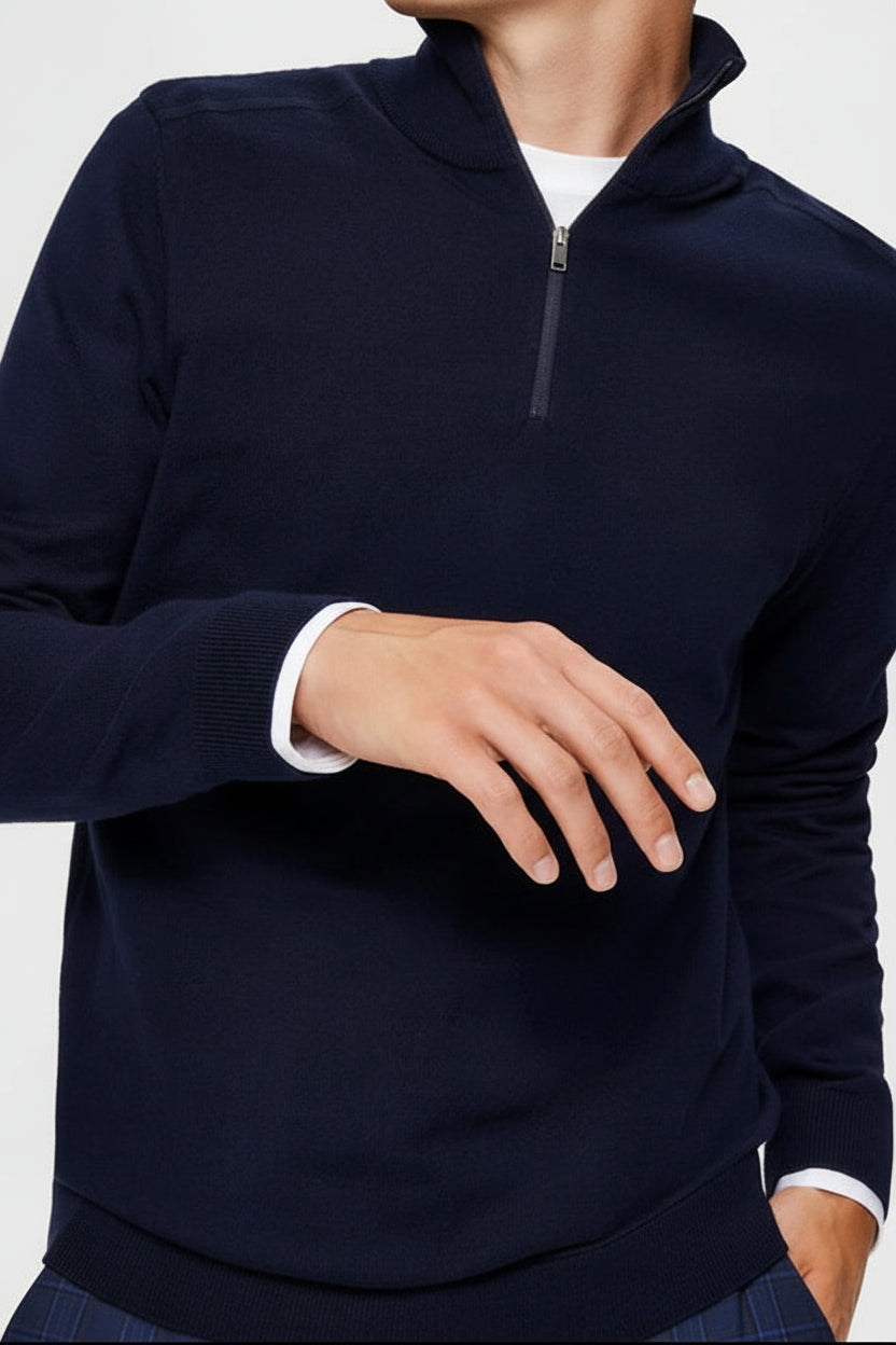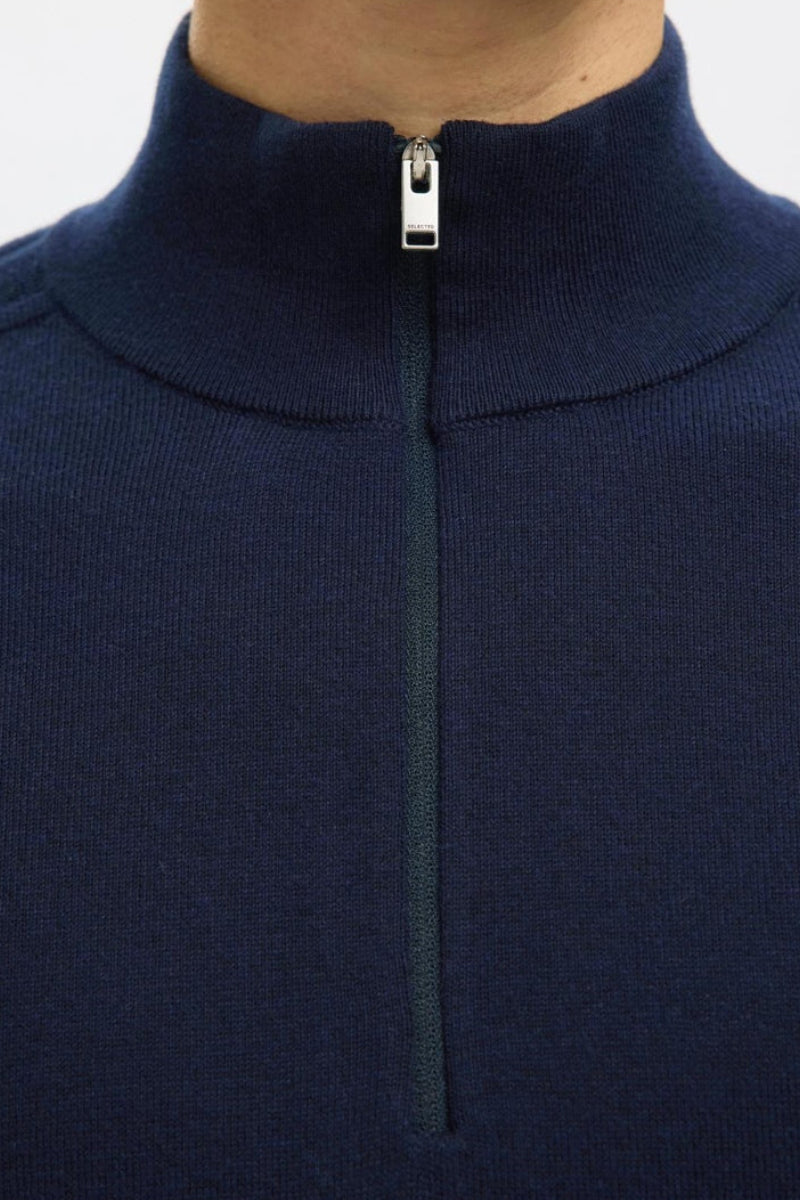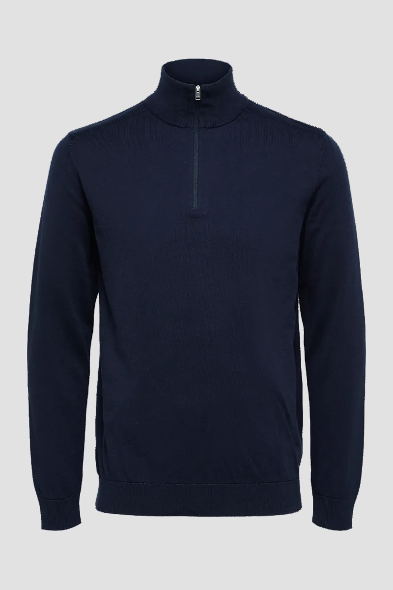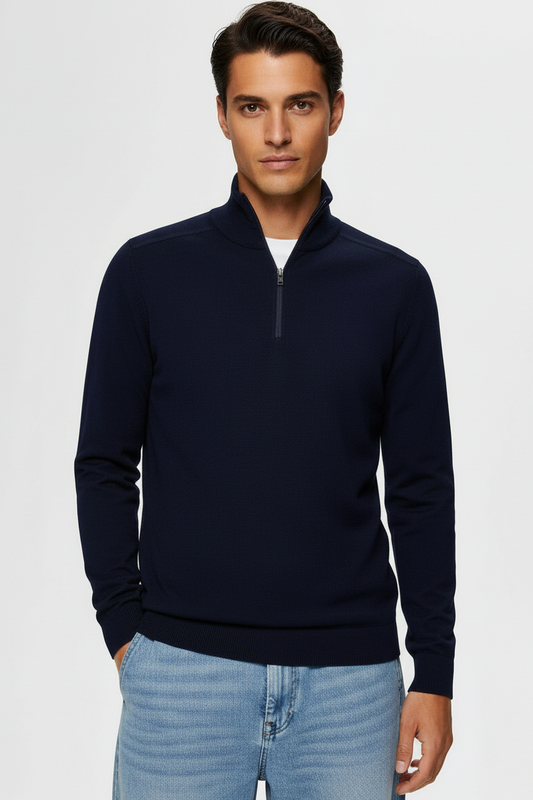 Dieser Half-Zip-Pullover bietet eine zeitlose und angenehme Wahl für den Alltag. Der Pullover überzeugt durch seinen hohen Kragen und die langen Ärmel mit gerippten Bündchen, die für optimale Passform und Komfort sorgen. Dank des Halb-Reißverschlusses lässt sich der Kragen individuell öffnen und schließen. Das regelmäßige Schnittdesign unterstreicht einen klassischen Look, der vielseitig kombinierbar ist. Das dunkelblaue Melange sorgt für subtile Detailvielfalt.