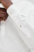 - Das Hemd hat eine halbe Knopfleiste und lange Ärmel.