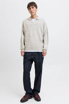 Er ist aus weichem und flexiblem Feinstrick gefertigt, der recyceltes Polyester mit Acryl und einem kleinen Anteil verantwortungsvoller Wolle kombiniert – für zusätzliche Wärme und Langlebigkeit. Die hellgraue Melange-Farbe verleiht dem Pullover einen zeitlosen Look, der sich in jede Garderobe einfügt.