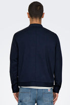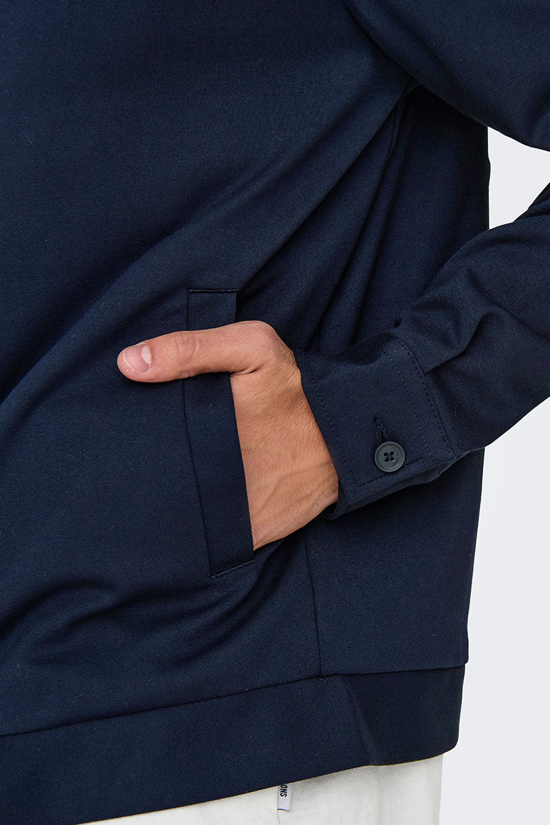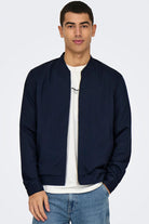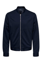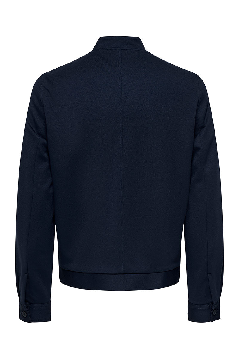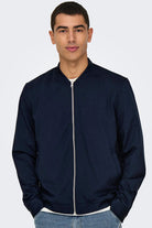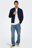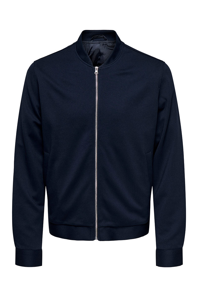 - Dunkelblaue Bomberjacke mit Reißverschluss.