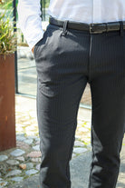 Die schwarze Farbe in Kombination mit den stylischen weißen Nadelstreifen macht diese Komforthose zu einer gepflegten und modischen Wahl für jeden Anlass. Das subtile Muster ermöglicht ein harmonisches Kombinieren der Hose mit verschiedenen Farben und Designs. -