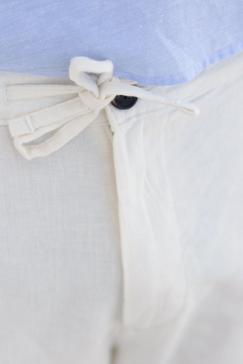 Diese Leinen-Shorts bieten mit ihrem regulären Schnitt und dem mittelhohen Bund einen angenehmen Sitz. Der Bund lässt sich mit einem Kordelzug individuell anpassen, was für zusätzlichen Komfort sorgt. Das Material vereint organische Baumwolle mit Leinen und einem kleinen Anteil Elastan, wodurch die Shorts sowohl atmungsaktiv als auch leicht elastisch sind. Die dezente Farbe »Cloud dancer« wirkt frisch und passt ideal in die Frühlingssaison.