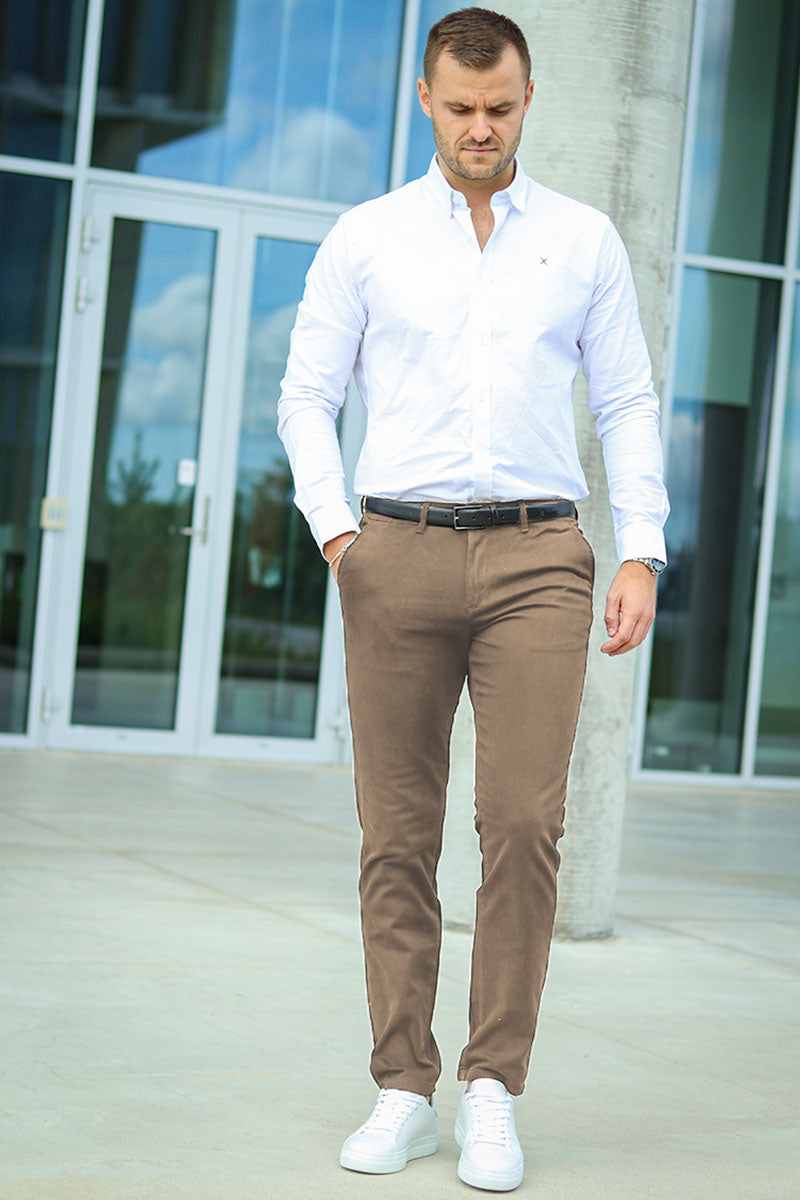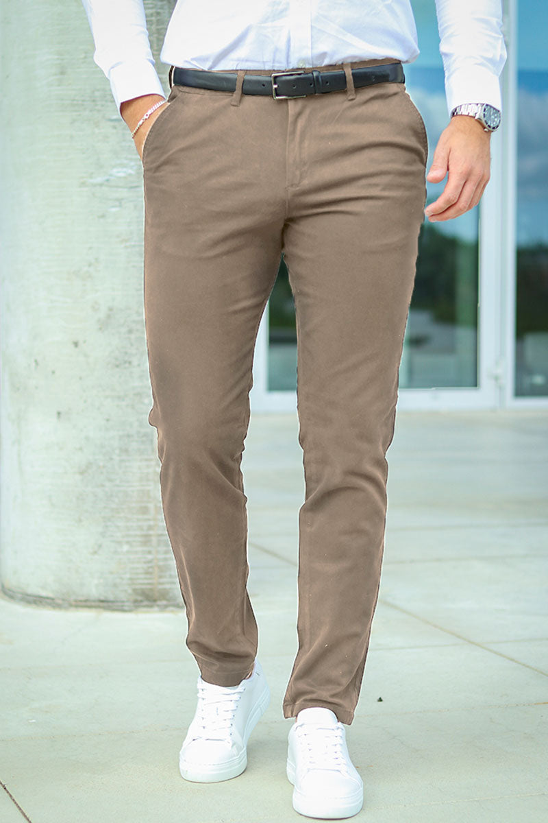Diese Slim-Fit-Chinohose in einem warmen Beigeton überzeugt durch ihren modernen Schnitt mit mittlerer Leibhöhe und einem schmal zulaufenden Bein. Das Material bietet dank eines Elastananteils zusätzlichen Komfort und sorgt für eine angenehme Passform. Die Hose zeichnet sich durch ihr schlichtes Design mit klassischen Front- und Gesäßtaschen aus, perfekt für einen lässigen, dennoch gepflegten Look.