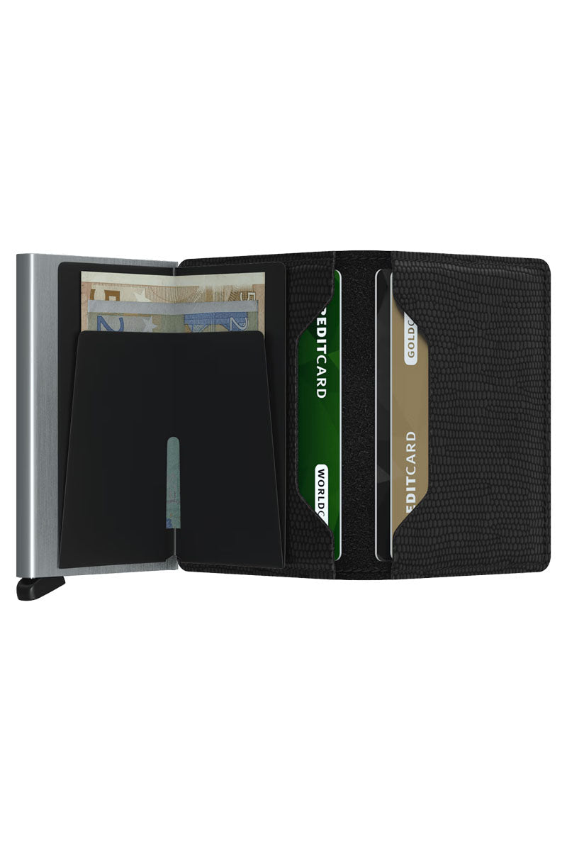 • Platz für 4 geprägte oder 6 flache Karten, bis zu 6 Karten in der äußeren Hülle, Geldscheine, Visitenkarten und Quittungen