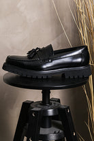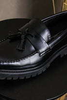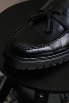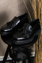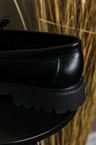 - Die Schuhe haben eine abgerundete Spitze und eine grobe Sohle