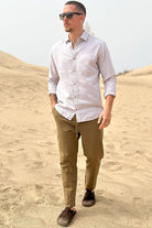 - Langes Leinenhemd mit klassischem Kragen.