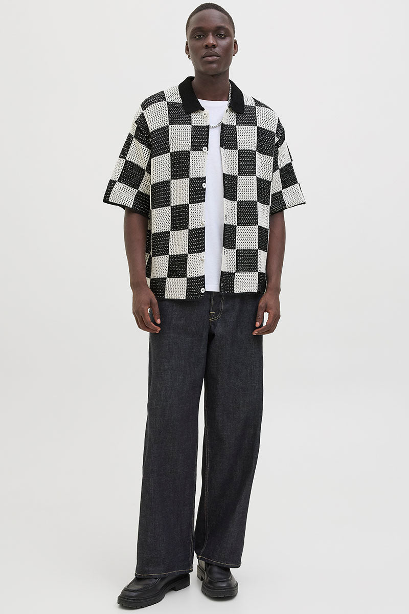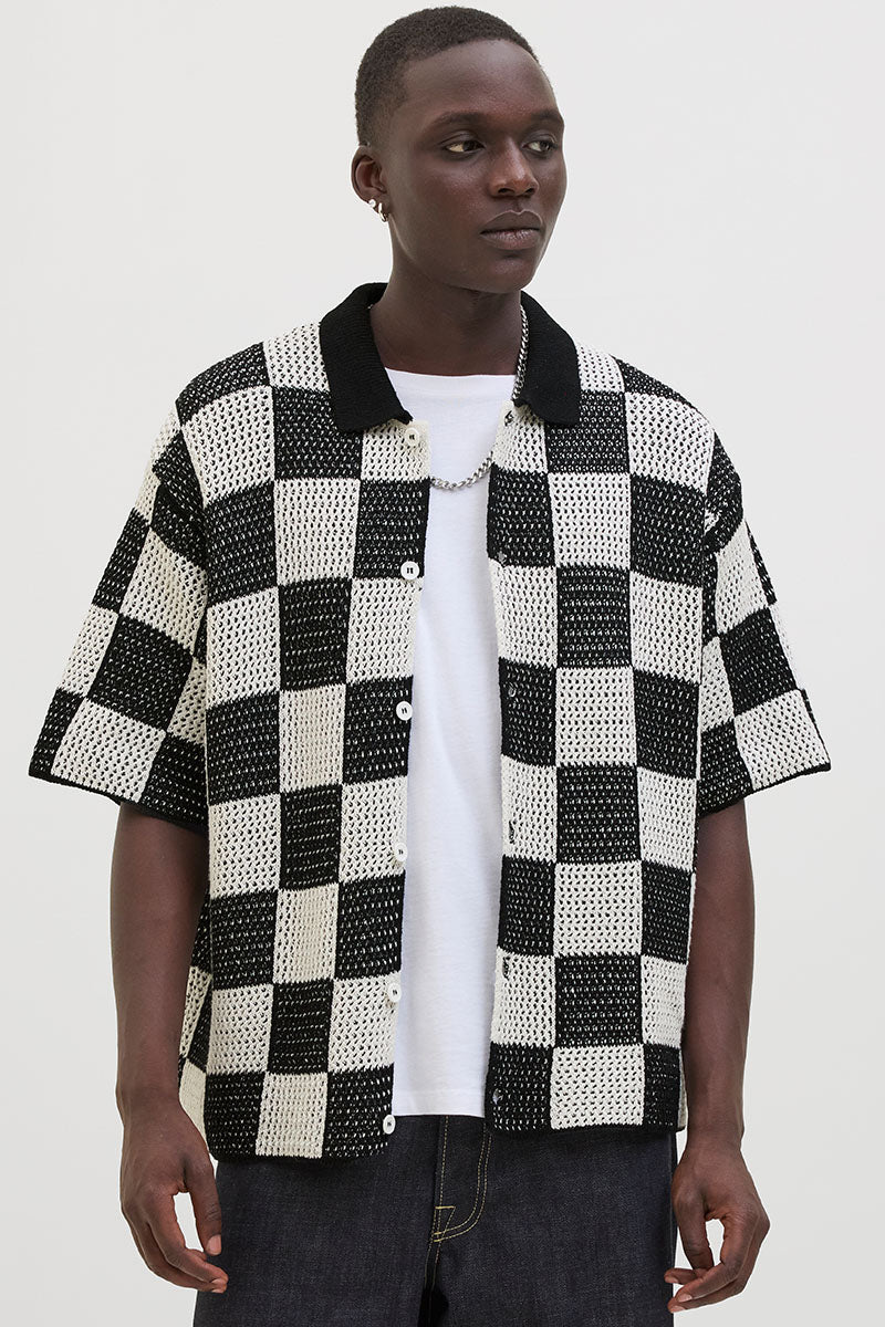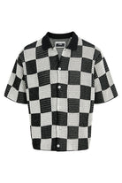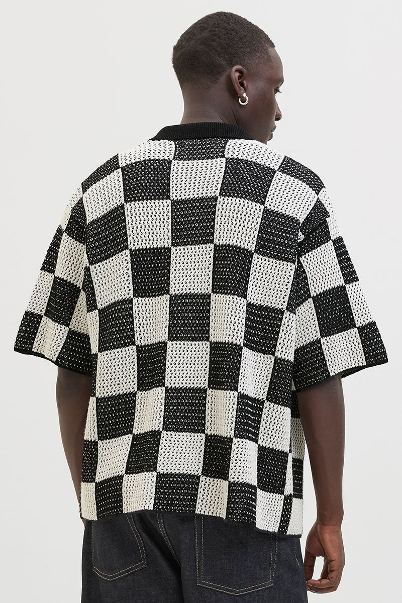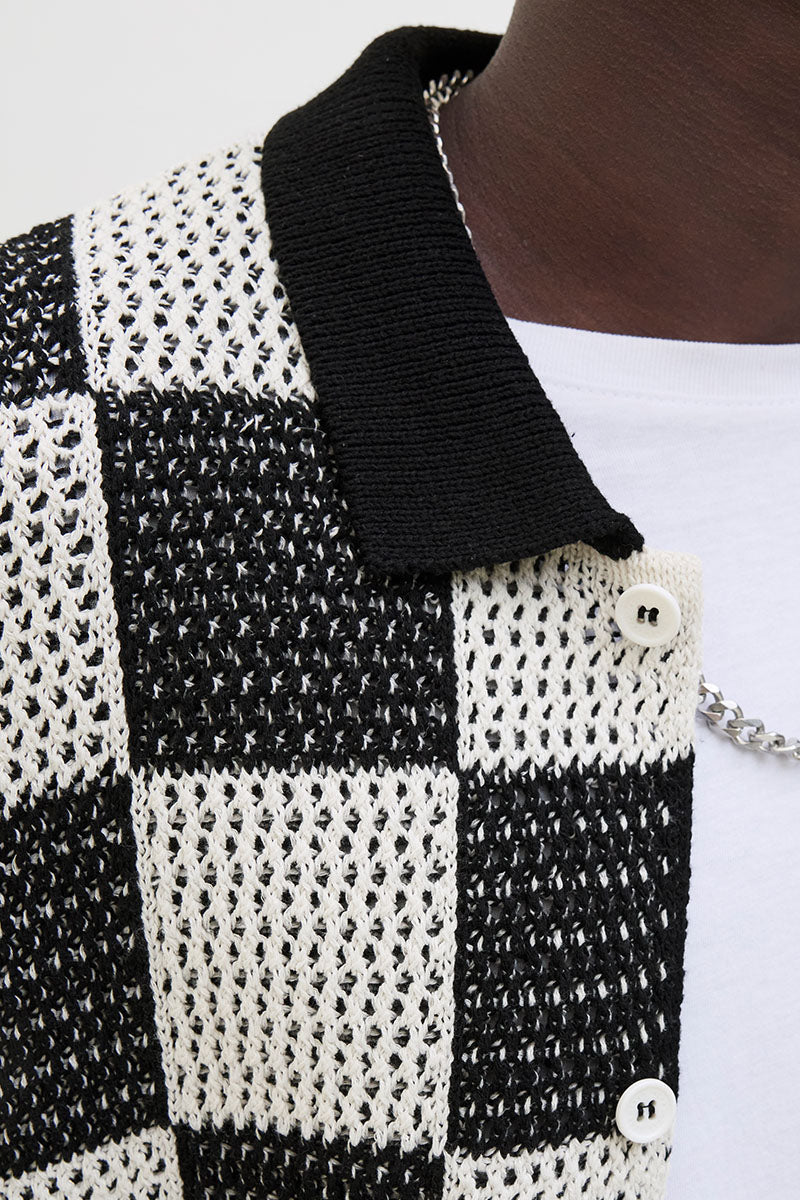- Kurzärmliger, karierter Strick in lockerem Schnitt.