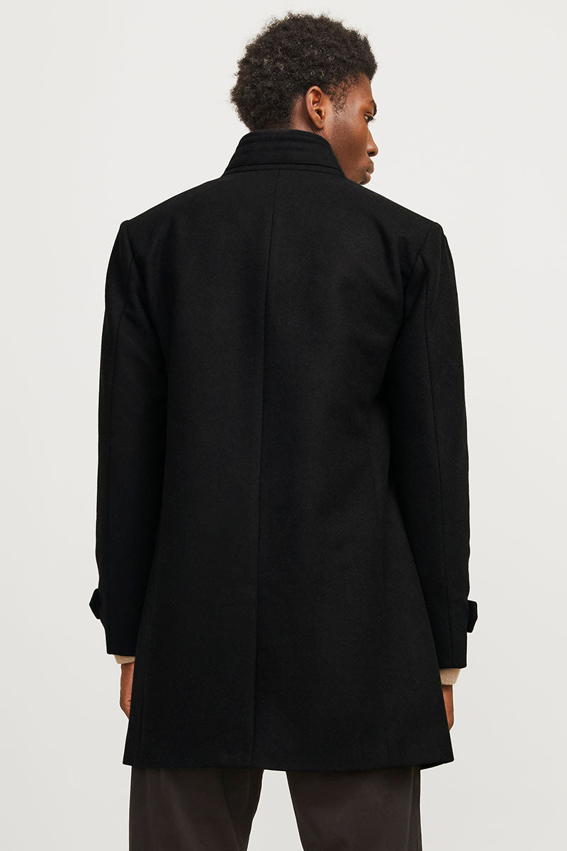 - Schwarzer Wollmantel mit zwei schrägen Taschen