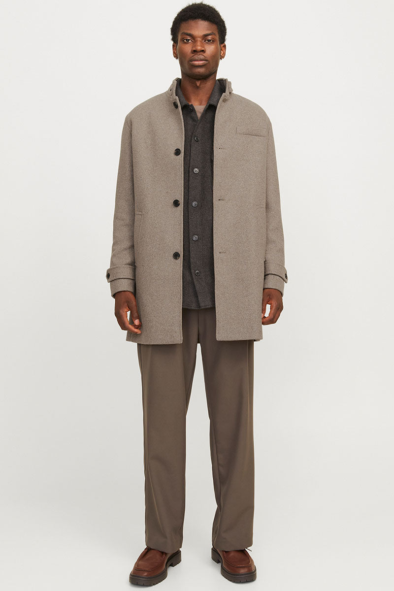 • Einfarbiger Wollmantel mit zwei schrägen Taschen