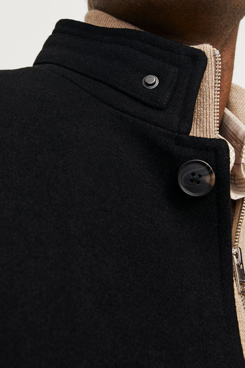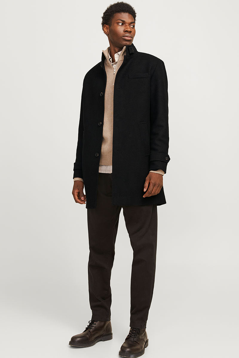 - Schwarzer Wollmantel mit zwei schrägen Taschen