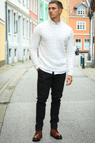- Weißer langärmeliger Strickpullover.