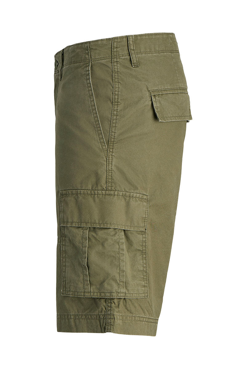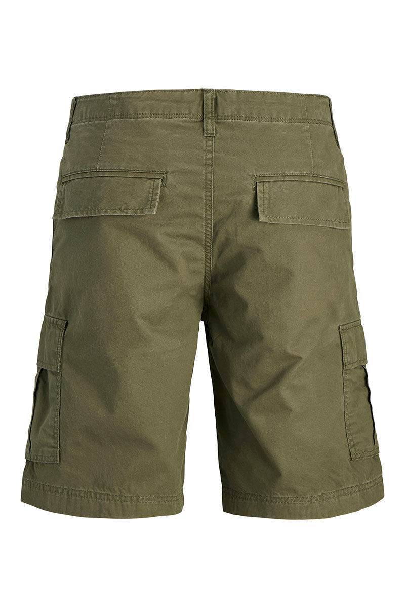 - Armeegrüne Cargo-Shorts mit Knopf- und Reißverschluss.