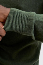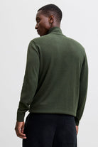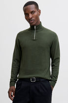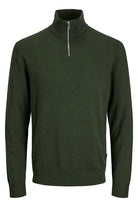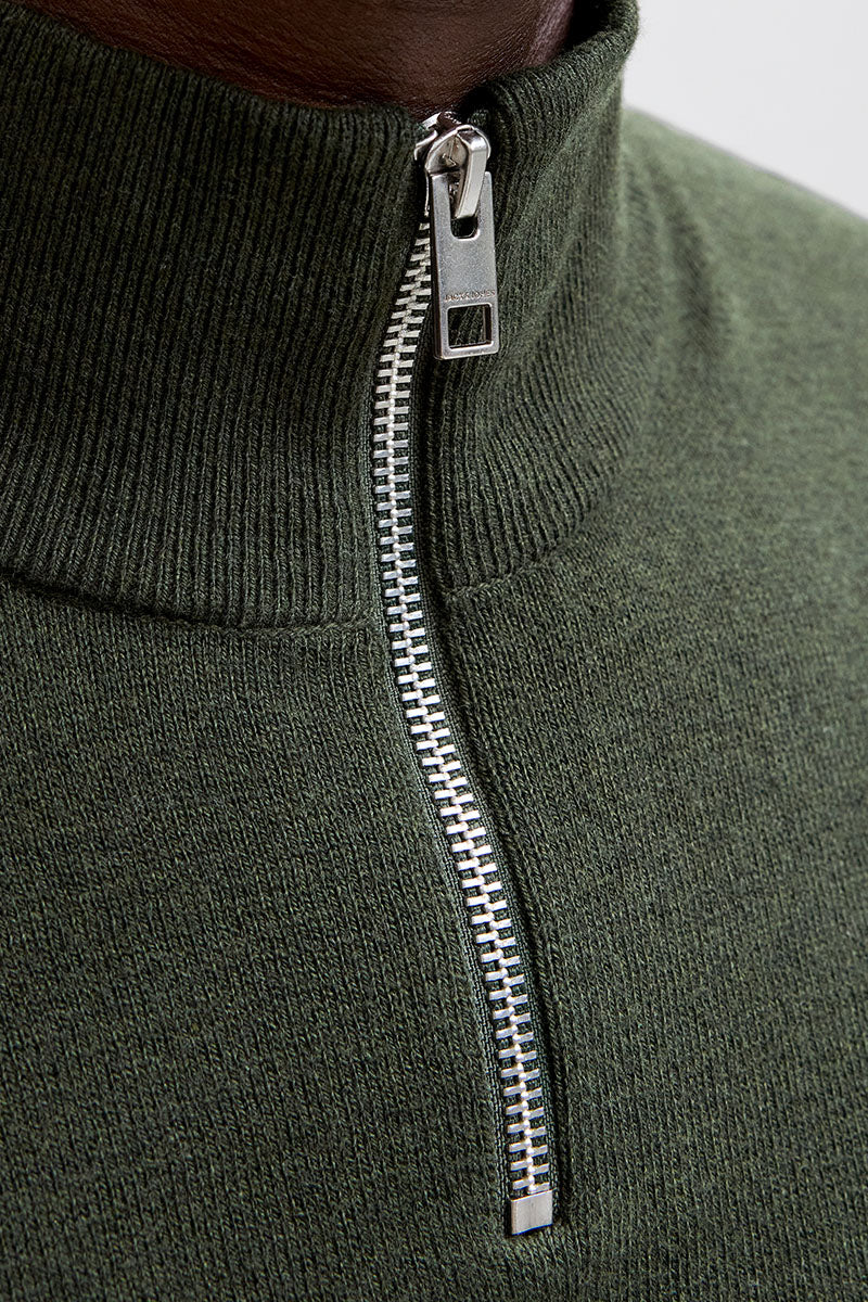 • Dunkelgrüner Langarm‑Strickpullover mit halbem Reißverschluss