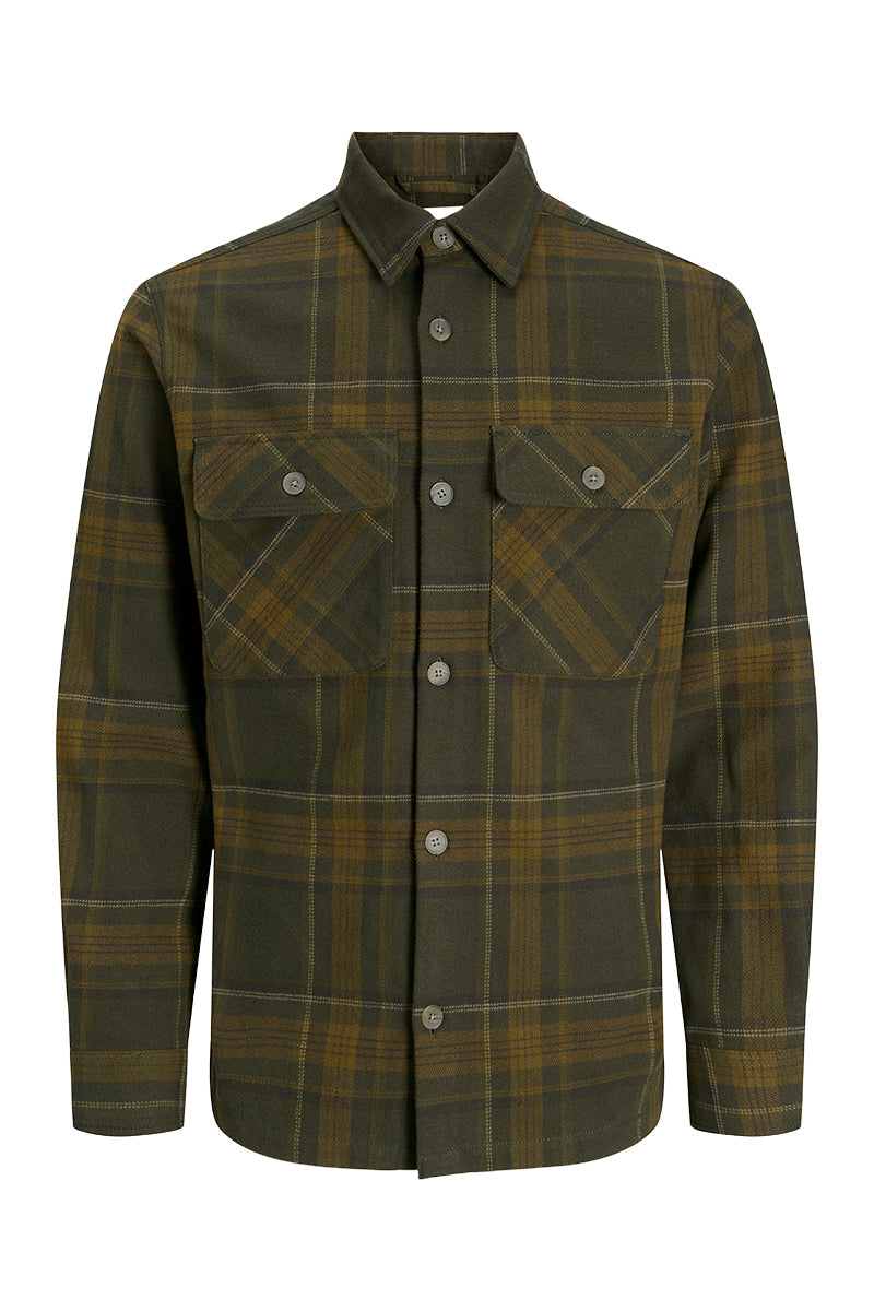 • Dunkelgrünes langärmeliges kariertes Overshirt