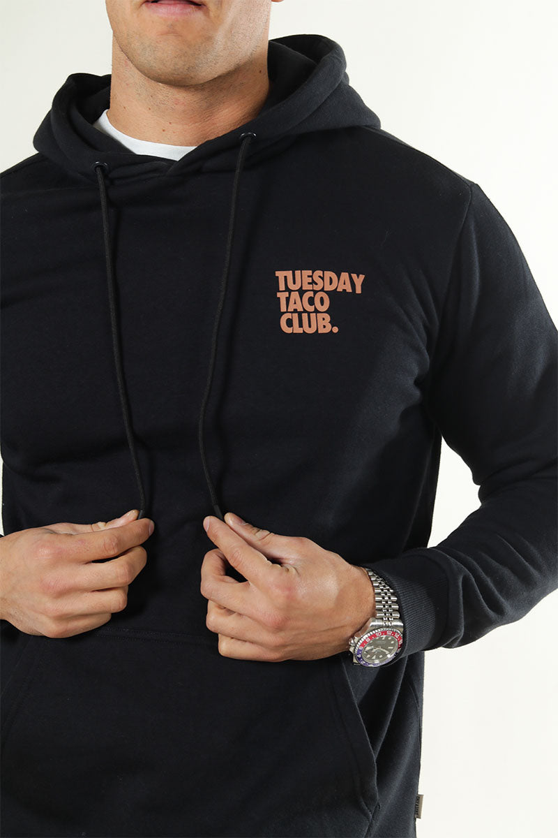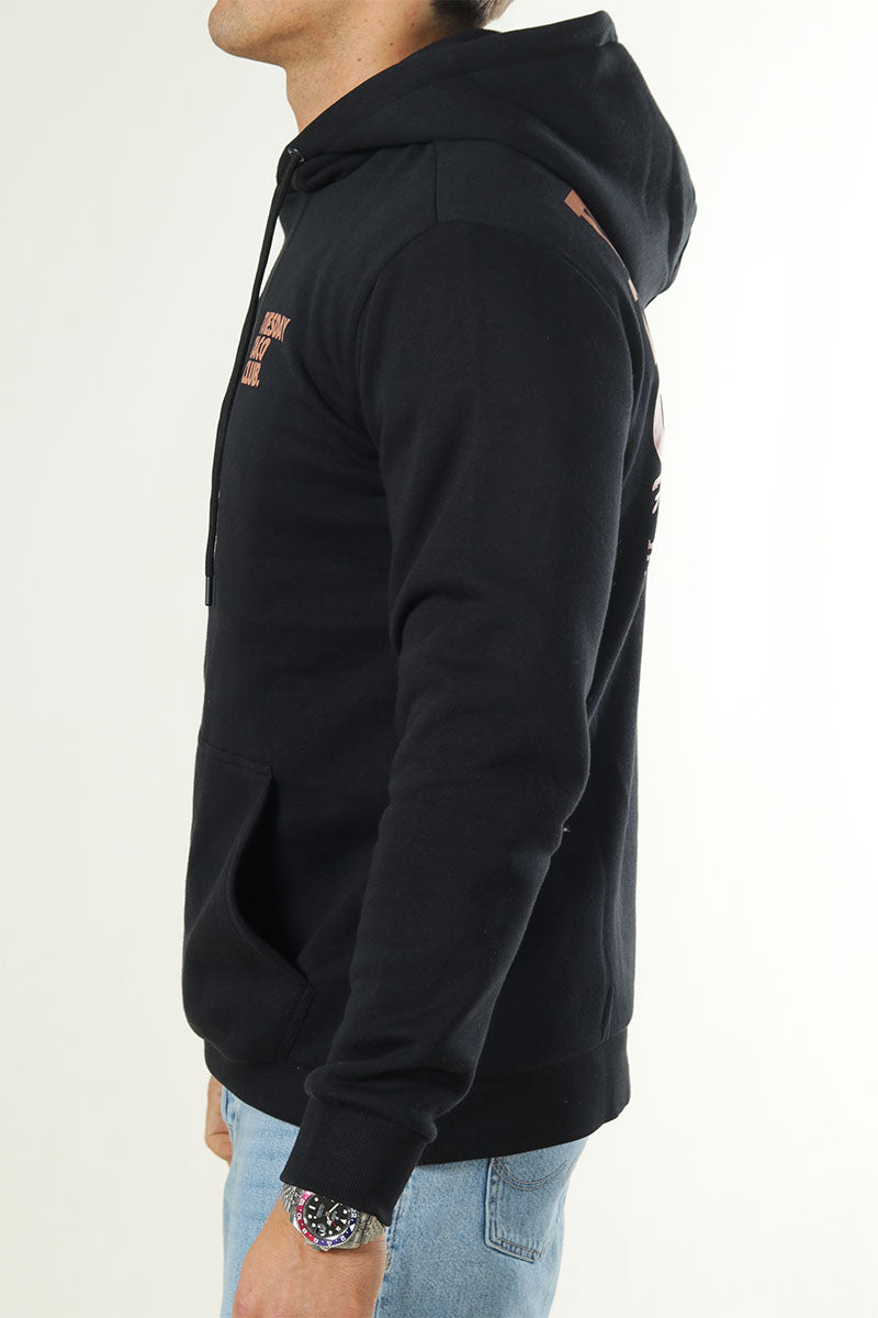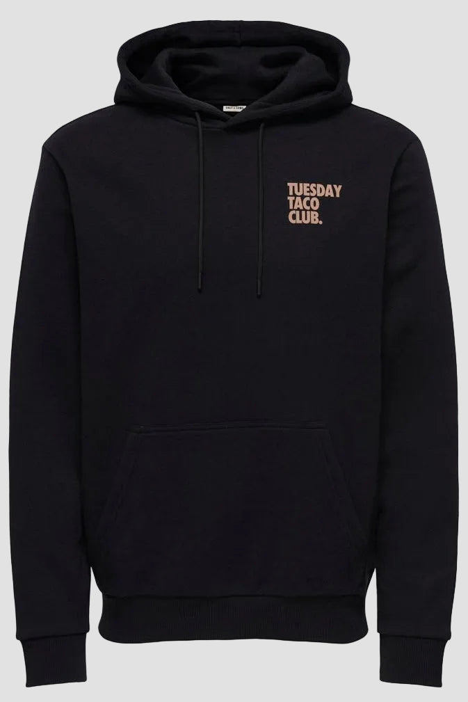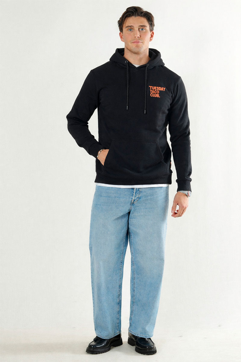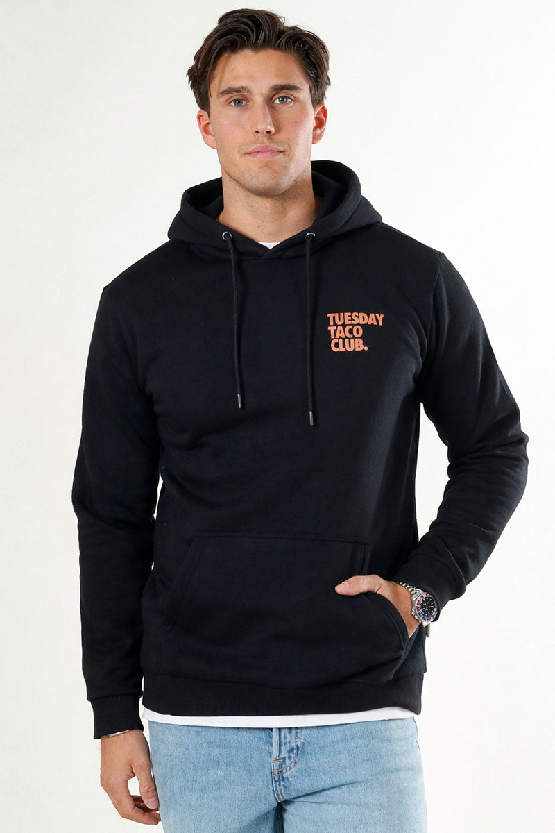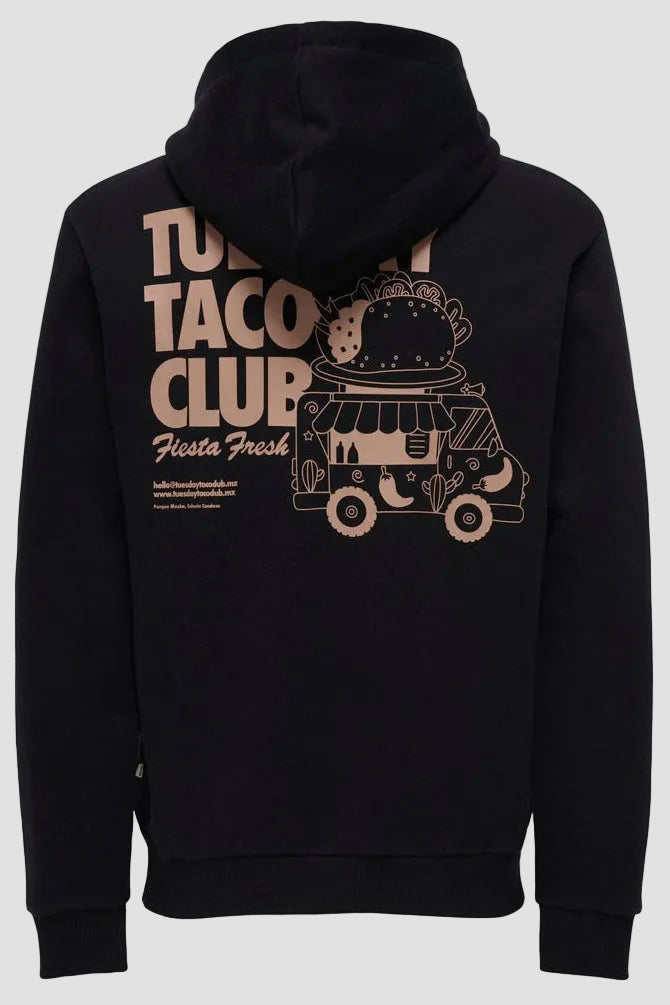 Der Food Fiesta Reg Hoodie bietet ein angenehmes Tragegefühl dank der Kombination aus 65 % Baumwolle und 35 % recyceltem Polyester. Der Kapuzenpullover in klassischem Schwarz zeichnet sich durch einen geraden Schnitt mit langen, eingesetzten Ärmeln und einem Rundhalsausschnitt aus. Ein auffälliger Print auf Vorder- und Rückseite verleiht dem Hoodie einen modernen Look. Die Kängurutasche und die praktische Kordelverschluss runden das Design ab.